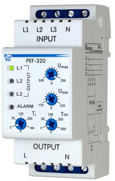 PEF-320 הוא מתג פאזה אלקטרוני אוטומטי המספק מתח חד-פאזי יציב ביציאה לצרכן (230V, 50Hz) ממערכת תלת-פאזית (3×400V + N)